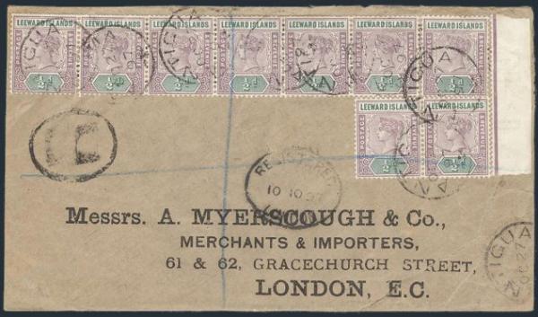 2927 1 image1 (9), Tied by Antigua 27 Oct 1897 CDS's on Reg'd business reply envelope to London, England. F, cover tear at LR. Very attractive Victorian multiple usage (Image) Estimate 100.00+ $Cdn