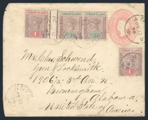 2928 1, 2 image1 (Pair), 2 (2), Tied by Antigua 12 July 1898 CDS's on QV 1p Postal Stationery envelope to Birmingham, Albama (23 July b/s). F-VF, some toning, slightly reduced. Attractive (Image) Estimate 125.00+ $Cdn