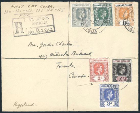 2937 120-5 image120-5, Complete KGVI set tied by St John's, Antigua 1 July 1949 CDS's on Reg'd FDC to Canada. VF (Image) Estimate 45.00+ $Cdn