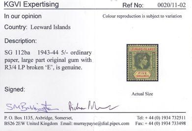 2936 113 image113, KGVI Five Shilling on ordinary paper with BROKEN "E" in "LEEWARD" variety, fresh, nicely centered, VF, OG. This is from the 1943-4 Printing. Has Murray Payne Certificate signed by KGVI experts S. Babbington & D. Pollard (SG #112ba, Cat £1,200) (Image) (View Certificate)