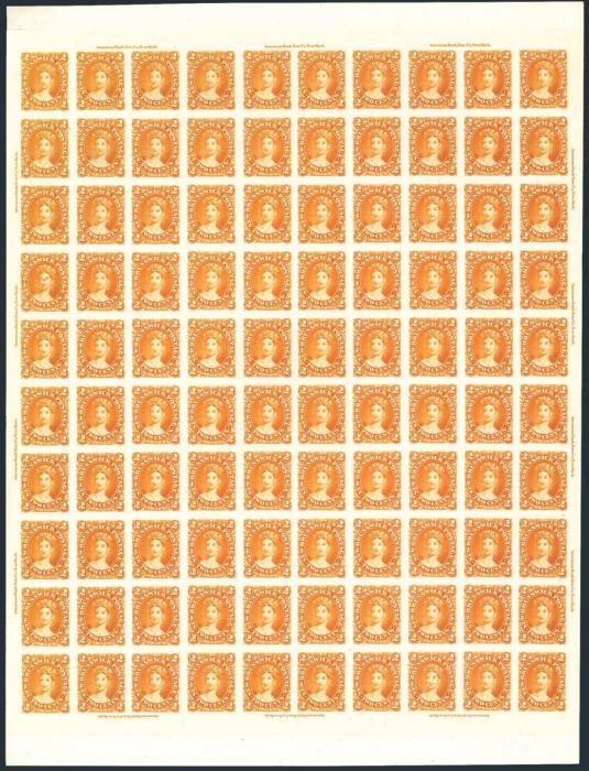 7P, Complete Plate Proof sheet of 100 on card of the 2¢ QV in issued colour. Has 14 Plate Imprints in the selvedge. XF. Scarce (Image)