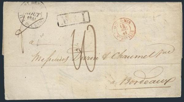 3020   imageStampless folded ship letter with St Denis, Isle Bourbon (Mauritius) 1 Aug 1841 CDS to Bordeaux. Has boxed "M & I" (Mauritius & India) h/s, red Versailles 14 Dec arrival strike via Reunion. Written in French. F-VF. Write-up accompanies (Image) Estimate 75.00+ $Cdn