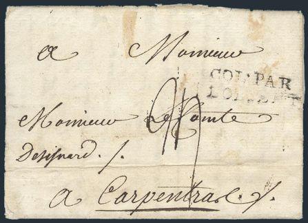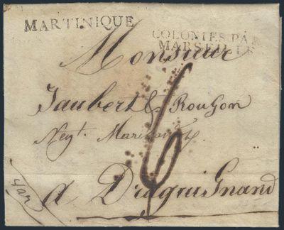 3015   imageStampless folded letter written from St. Pierre 11 July, 1816 to France. Has s/l "MARTINIQUE" and "COLONIES PAR MARSEILLES" handstamps. F, some age staining adds to the charm of this early West Indies cover (Image) Estimate 400.00+ $Cdn