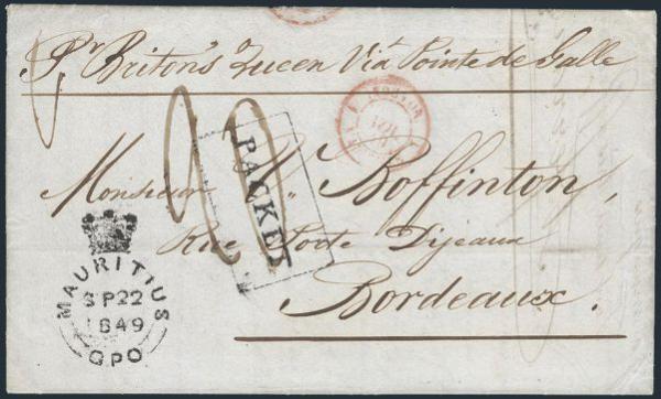 3021   imageStampless folded letter with a bold VF strike of a MAURITIUS GPO CROWNED 22 Sp, 1849 datestamp, sent from Port Louis to Bordeaux, France. Has boxed "PACKET" h/s carried on the ship "Briton's Queen" via Ceylon. On reverse has COLOMBO STEAMER LETTER 12 Oct 1849 and Bordeaux receiver. Has m/s "20" rate marking. A SCARCE EARLY COVER IN LOVELY CONDITION. VF (Image) Estimate 700.00+ $Cdn