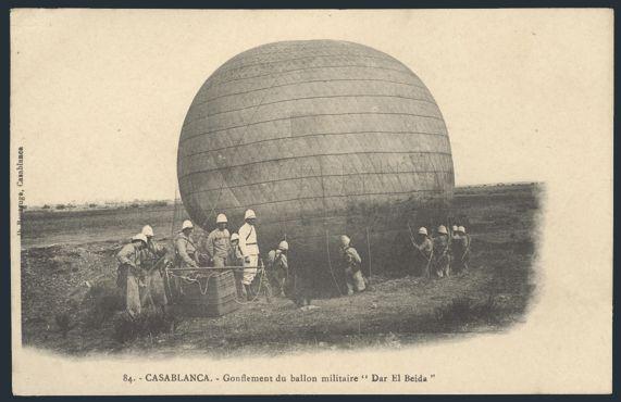 3064   imageUnused b/w photo postcard circa 1910 depicting a large MILITARY BALLOON named "Dar El Beida" at Casablanca. Shows the Balloon held down by French soldiers. VF (Image) Estimate 60.00+ $Cdn