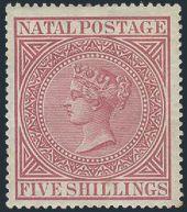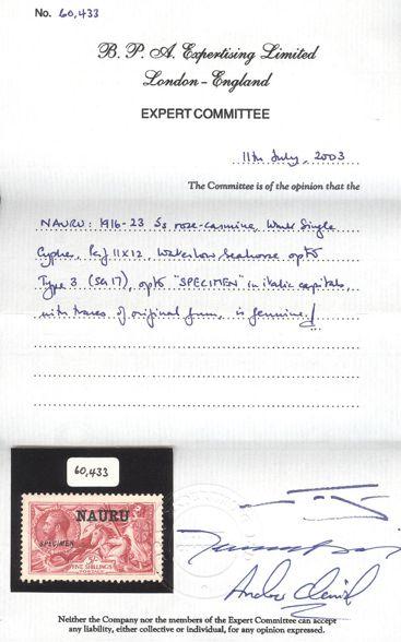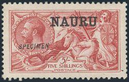 3073 14b image14b, KGV Five Shilling Seahorse, Waterlow Printing, with "SPECIMEN" overprint. Fresh attractive colour, VF, part OG, couple nibbed perfs. Has 2003 BPA Certificate. Ex Gillis. A RARE STAMP (SG #17s, Cat £1,800) (Image) (View Certificate)