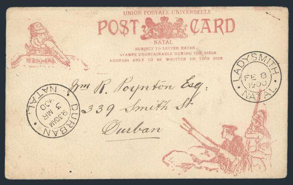 3071   imageFree franked BOER WAR era red illustrated (front & back sides) Patriotic postcard with Ladysmith 8 Feb 1900 CDS to Durban (3 Mar receiver). Depicts Boer & British firing Canons at each other, regional scene & Town Hall tower, Ladysmith. F (Image) Estimate 150.00+ $Cdn