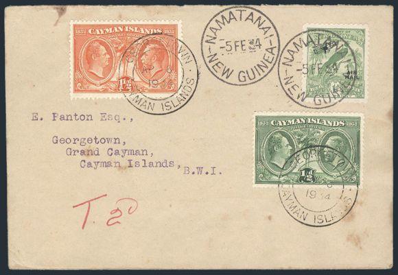 3147 C15 imageC15, Tied by VF Namatani 5 Feb, 1934 CDS on underpaid cover to the CAYMAN ISLANDS. Has 2 diff Cayman stamps applied & cancelled by Georgetown 8 Ap, 1934 CDS's which pay the 2 pence postage due. F, toning on reverse (Image) Estimate 200.00+ $Cdn