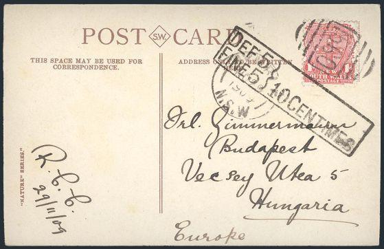 3156 121, 122 image121 (2), 122 (3), Tied by Pymble (3) and Sydney 1909-10 cancels of 4 diff scenic postcards addr to BUDAPEST HUNGARY. All are SHORTPAID with boxed "DEF 5 / FINE 5 / 10 CENTIMES" h/s's. F (Image) Estimate 100.00+ $Cdn