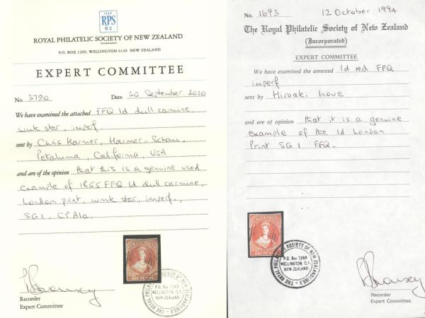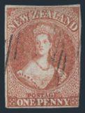 3157 1 image1, Rare first issue London print of the One Penny QV Chalon. F-VF, large margins on three sides (slightly in at LR), vivid colour, light face-free barred oval cancel. Has 1994 & 2020 Royal Philatelic Society of New Zealand Certificates. A VERY RARE STAMP! (Image) (View Certificate)