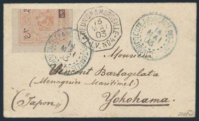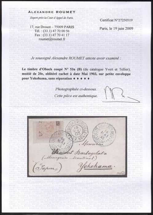 3249 53b image53b, Left half BISECT neatly tied on miniature size cover from Djibouti 14 May, 1903 to YOKOHAMA JAPAN (very scarce destination). Has Reunion to Marseille No. 4 Paquebot cancel. VF. AN UNUSUAL & CHOICE COVER. Has Pierre Mayer guarantee b/s and 2009 Roumet Certificate (Image) (View Certificate)