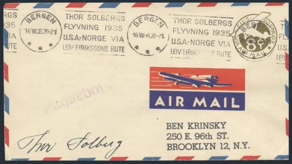 3237 USA #UC7 imageUSA #UC7, With Bergen / THOR SOLBERG 1935 USA - NORWAY via LEIF EIRIKSSON's ROUTE flight cancel addr to Brooklyn. Has interesting "Paquebot" h/s & is signed by pilot "THOR SOLBERG". This was an Amphibian Flight from New York to Norway tracing Leif Eiriksson's Viking route some centuries before. VF (AAMC #1239) (Image) Estimate 450.00+ $Cdn