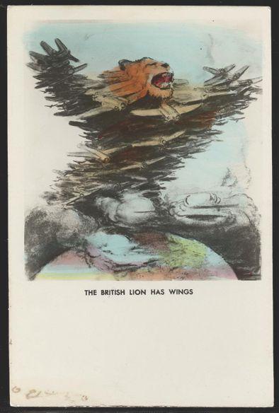 3259   imageUnused WWII colour illustrated PRO-BRITISH Patriotic postcard printed by Orient Service Ltd., Jerusalem. Depicts lion in the sky composed of warplanes. Caption reads "The British Lion has Wings". F-VF. A scarce postcard! (Image) Estimate 100.00+ $Cdn