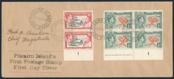 3274 1, 2 image1 (imprint block), 2 (imprint pair), Tied by Pitcairn Island 15 Oct 1940 CDS's on cach #10 unaddr FDC. Signed by FRED M. CHRISTIAN / Chief Magistrate. Served in that post 3 times from 1921-43. F-VF, tiny edge tear (Image) Estimate 100.00+ $Cdn