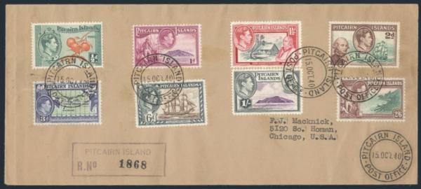 3275 1-5, 6, 7-8 image1-5, 6, 7-8, Tied by Pitcairn Island / Post Office 15 Oct 1940 CDS's on Reg'd #10 FDC to USA. F-VF (Image) Estimate 75.00+ $Cdn