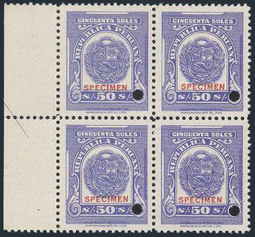 3272   imageNice set of 13 diff Revenues in blocks from 1¢ to 50 Soles showing coat of arms. All with "SPECIMEN" overprints & security punches from the American Bank Note Co. F-VF, NH (52 stamps) (Image) Estimate 75.00+ $Cdn