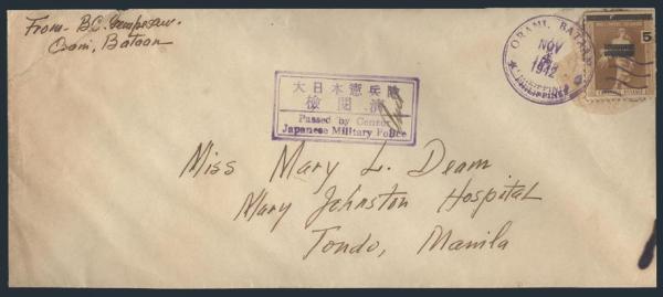 3273 N4 imageN4, Japanese Occupation of Philippines 5¢ on 6¢ tied by Orani, Bataan 4 Nov 1942 cancel on large size cover addr to Manila. Has nice clear Japanese Military Police censor marking. F (Image) Estimate 100.00+ $Cdn