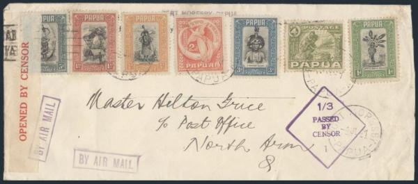 3263 94-100 image94-100, Seven diff stamp franking neatly tied by Port Moresby 4 July, 1941 CDS's on #10 size airmail cover to Queensland (Brisbane b/s). Has Censor tape and violet Censor h/s. F-VF. AN EYE-CATCHING COVER! (Image) Estimate 125.00+ $Cdn
