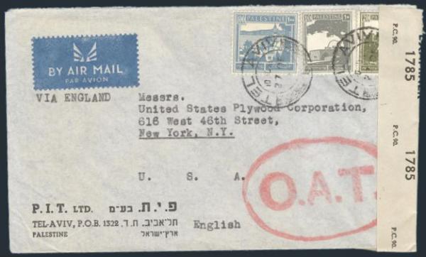 3258 73, 77, 80 image73, 77, 80, Tied by Tel Aviv CDS's on WWII censored airmail cover to New York. Has large red oval "O.A.T." h/s. F (Image) Estimate 45.00+ $Cdn