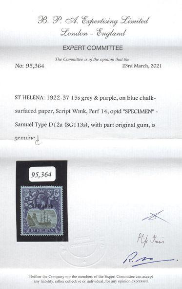 3412 94 image94, KGV 15 Shilling High Value with "SPECIMEN" overprint. Nicely centered, rich colour, VF. Has 2021 BPA Certificate (Image) (View Certificate)