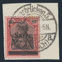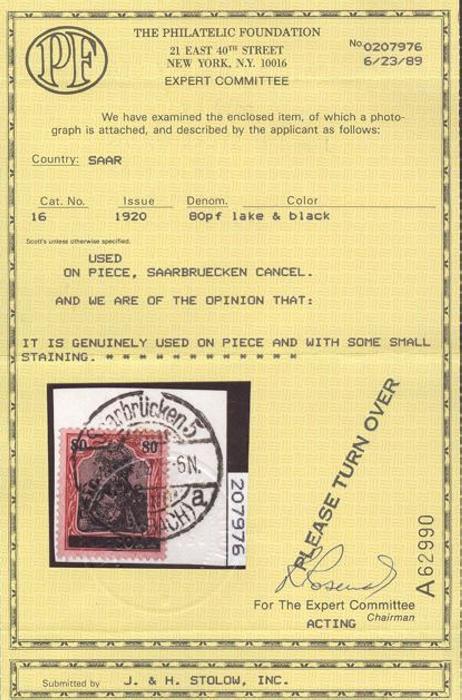 3403 16 image16, Genuine used 80pf tied on piece by neat Saarbrucken CDS cancel. VF, some small staining. Has 1989 Philatelic Foundation Certificate (Image) (View Certificate)