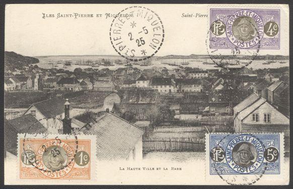 3442 79, 81, 83 image79, 81, 83, Tied by St. Pierre & Miquelon 2 May 1925 CDS's on face of b/w photo postcard depicting St. Pierre with the busy harbour in the distance. VF, unaddr. Attractive (Image) Estimate 45.00+ $Cdn