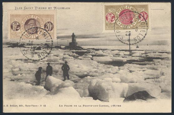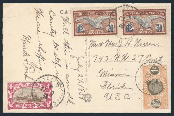 3444 86-7 image86-7, Tied by St. Pierre & Miquelon 14 June 1929 CDS's on front of b/w photo postcard to USA. The scene on the postcard is the one used for the design of the Scott #A25 showing the Tortue Lighthouse. VF (Image) Estimate 50.00+ $Cdn