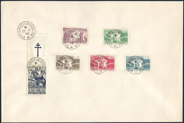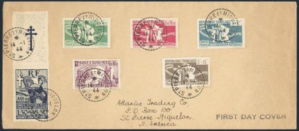 3453 French Colonies #'s B1-6 imageFrench Colonies #'s B1-6, Tied by St. Pierre & Miquelon 14 Jan 1944 CDS on local #10 FDC. F-VF (Image) Estimate 135.00+ $Cdn