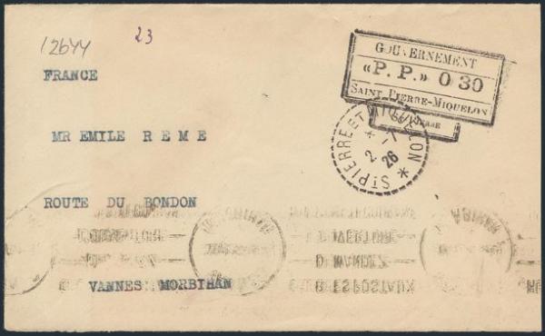 3451   imageStampless cover with boxed "Gouvernement / P.P. 030" Provisional h/s & 2 July 1926 CDS to Vannes, France. VF, slightly reduced (Image) Estimate 40.00+ $Cdn