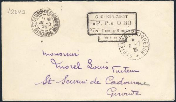 3452   imageStampless cover with boxed "Gouvernement / P.P. 030" Provisional h/s & 6 July 1926 CDS to France; St. Seurin de Cadourne 31 July receiver. VF (Image) Estimate 45.00+ $Cdn