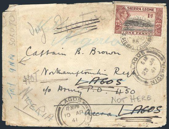 3516 174 image174, Tied by 20 Nov, 1940 CDS WWII Censored British Military cover addr to a Captain at Army P.O. 450 in Accra. It was then forwarded to Lagos & has b/s's from Okoto Nigeria & Zaria. Has numerous m/s directional markings and tape censor. VG+ (Image) Estimate 75.00+ $Cdn