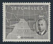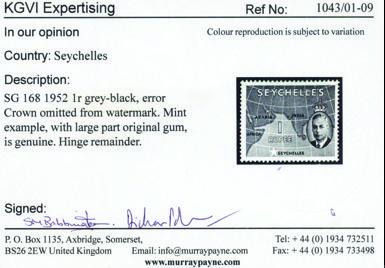 3504 167a image167a, KGVI One Rupee with St. Edward's Crown Watermark (in error) and MISSING CROWN IN WATERMARK. Rich fresh colour, F-VF. Has Murray Payne Certificate signed by KGVI experts S. Babbington and Dickton Pollard. AN INCREDIBLY RARE DOUBLE ERROR (SG #168a, Cat £4,000) (Image) (View Certificate)