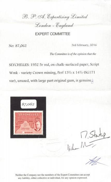 3505 170a image170a, KGVI 5 Rupee with St. Edward's Crown Watermark (in error) and MISSING CROWN IN WATERMARK. Rich bold colour, nice centering, fresh, VF, LH. Has 2016 BPA Certificate. AN INCREDIBLY RARE DOUBLE ERROR (SG #171a, Cat £4,000) (Image) (View Certificate)
