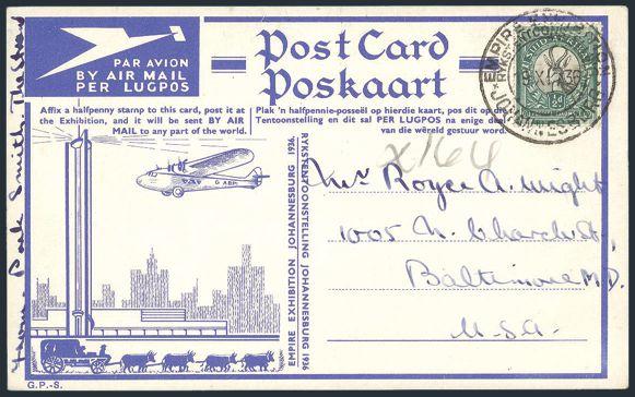 3551 33b image33b, Tied by Empire Exhibition, Johannesburg 19 Oct 1936 special cancel on matching b/w photo blue illustrated postcard to USA. Card depicts Armstrong / Whitworth AW.15 Atlanta "Amalthea / Royal Mail" plane upon arrival (crashed at Kisumu, Kenya July 1938). VF (Image) Estimate 50.00+ $Cdn