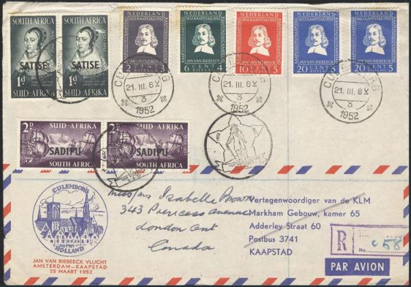 3560 120-1 image120-1 (Pairs); Also Netherlands #'s B234-7, Tied on 1952 Reg'd South Africa-Netherlands double cach Van Riebeeck Special Return Flight cover, addr to Canada. F (Image) Estimate 50.00+ $Cdn
