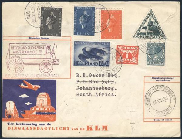 3564 B5-8 imageB5-8, Also Netherlands 142, 159, 209-11, C10-1, Tied front and back on double cach KLM return flight cover with VOORTREKKER MONUMENT and Amsterdam 16-31 1938 cancels. Addr to England. F (Image) Estimate 75.00+ $Cdn