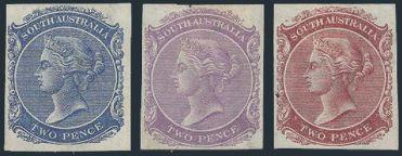 3575 (54) image(54), Coll of 7 imperforate QV Two Pence PROOFS, each in a diff colour. All on thin white watermarked paper. F-VF (7) (Image) Estimate 100.00+ $Cdn