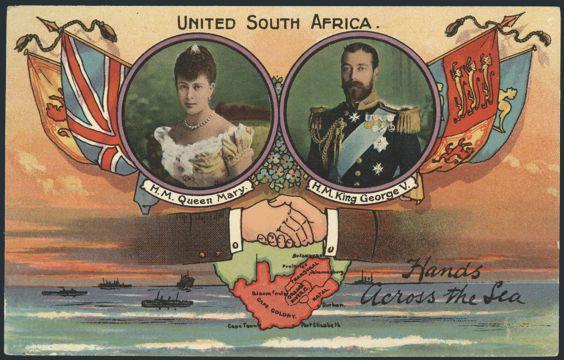 3568   imageUnused multi-coloured patriotic "HANDS ACROSS THE SEA" postcard circa 1912. Depicts portraits of KGV & Queen Mary, draped flags, map of United South Africa, etc. VF (Image) Estimate 65.00+ $Cdn