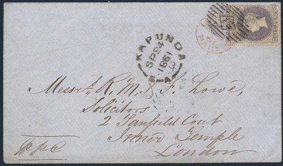 3573 20h image20h, Violet blue tied on neat cover from Kapunda, South Australia 24 Sp, 1861 to London, England. Has London receiver and blue Adelaide, So. Australia transit b/s. F-VF (Image) Estimate 70.00+ $Cdn