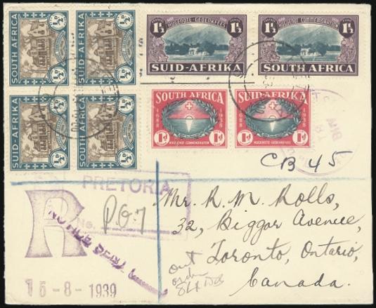 3565 B9-11 imageB9 (Block), B10-11 (Pairs), Neatly tied by Pretoria 1939 CDS's on Reg'd cover to Canada. VF. A pretty cover (Image) Estimate 50.00+ $Cdn