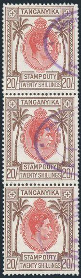 3679   imageKGVI 20 Shilling Stamp Duty Revenue strip of 3 with neat cancels. F-VF (Barefoot #8, Cat £105) (Image) Estimate 70.00+ $Cdn
