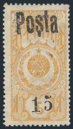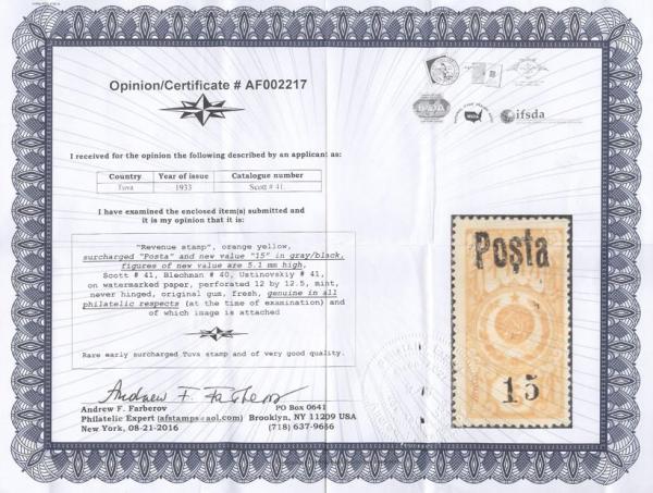 3680 41 image41, Rare early 15k on 6k orange yellow surcharged revenue stamp. F-VF, NH. Has 2016 Andrew Faberov Certificate (Image) (View Certificate)