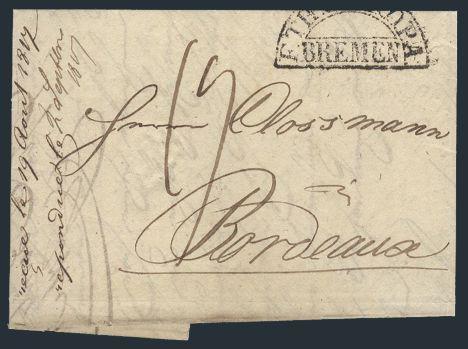 3699   imageStampless folded letter dated 7 Aug 1817 with "ETHUTAXOPA / BREMEN" rising sun type cancel to Bordeaux. Has "19" Decimes m/s rate. F-VF (Image) Estimate 50.00+ $Cdn