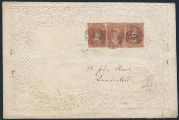 3689 29 image29 (3), Tied by grid "52" grid cancels on large fancy embossed Valentine envelope. Has red Pre-Paid 10 O-Clock, 14 Feb, 1867 cancel & addr to Launceston. F, a few minor flaws and address name excised. Very scarce (Image) Estimate 350.00+ $Cdn