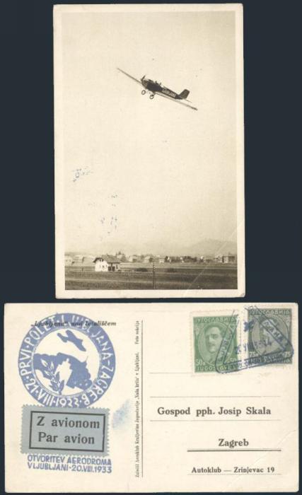 3841 65, 78 image65, 78, Tied by special blue triangular Ljubljana-Zagreb 20 Aug 1933 cancel on matching cach Flight postcard addr to Zagreb. Depicts the plane "LJUBLJANA" in flight. F-VF, corner crease (Image) Estimate 70.00+ $Cdn