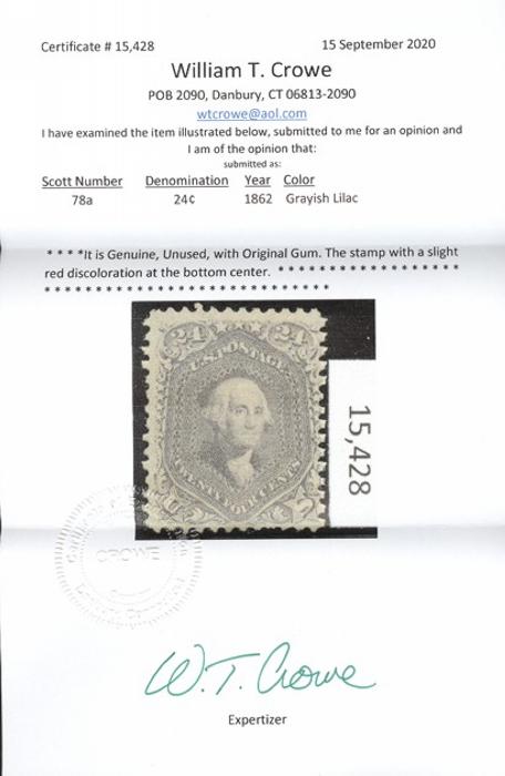 mint Grayish Lilac shade of the 24¢ Washington. F, OG, slight red discolouration at the bottom center. Has 2020 William T. Crowe Certificate (Image) (View Certificate)