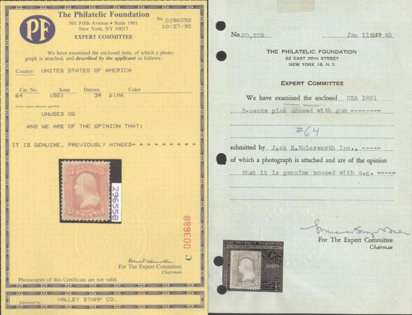 mint 3¢ PINK Washington extremely well centered within four large margins. VF, OG. Has original 1956 letter from Stanley Ashbrook, and 1965 & 1995 Philatelic Foundation Certificates. A rare item! (Image) (View Certificate)