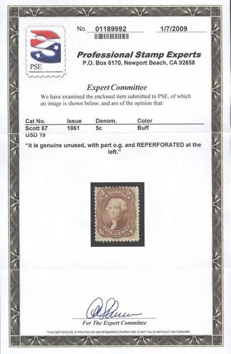 5¢ Buff Jefferson, fresh with clean colour, F-VF, large part OG, expertly reperfed at left. Has 2009 PSE Certificate. A VERY RARE MINT STAMP (Image) (View Certificate)