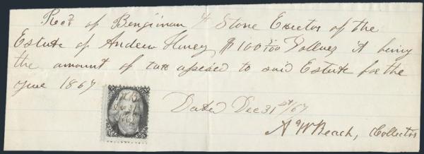 Jack 2¢ manuscript cancelled and fiscally used on a receipt for a real estate payment, dated 31 Dec, 1867. VG-F. Unusual item (Image)
