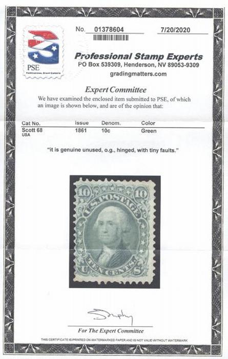 10¢ green Washington. F, OG, small flaws. Has 2020 PSE Certificate (Image) (View